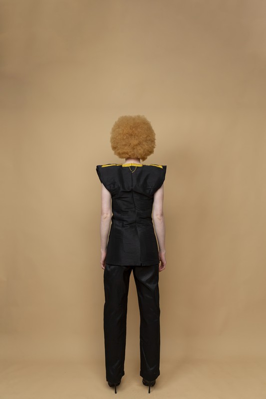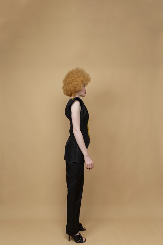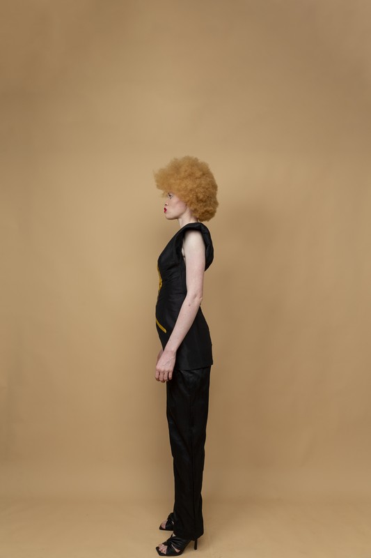 Short silk shantoum dress with shoulder pads and embroidery on the bust + pants